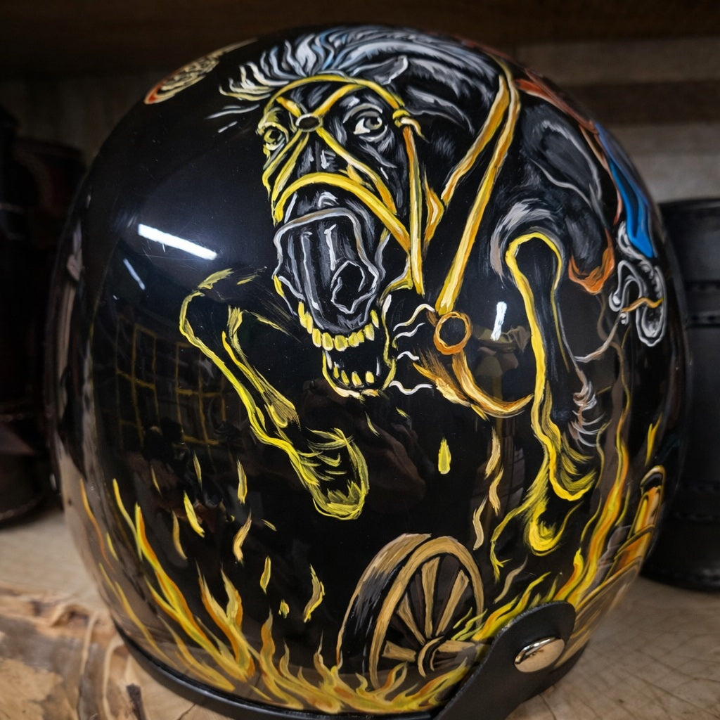 Il design raffigura un guerriero oscuro in corsa, tra cavalli in fiamme, cannoni e simboli di battaglia, evocando potenza, velocità e spirito indomabile. Ogni lato racconta una scena diversa, rendendo il casco un pezzo narrativo unico, intenso e carico di energia.