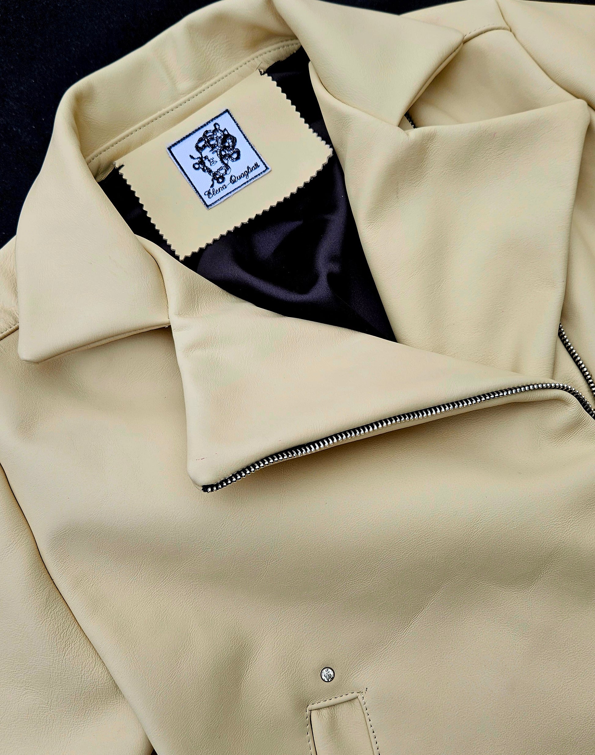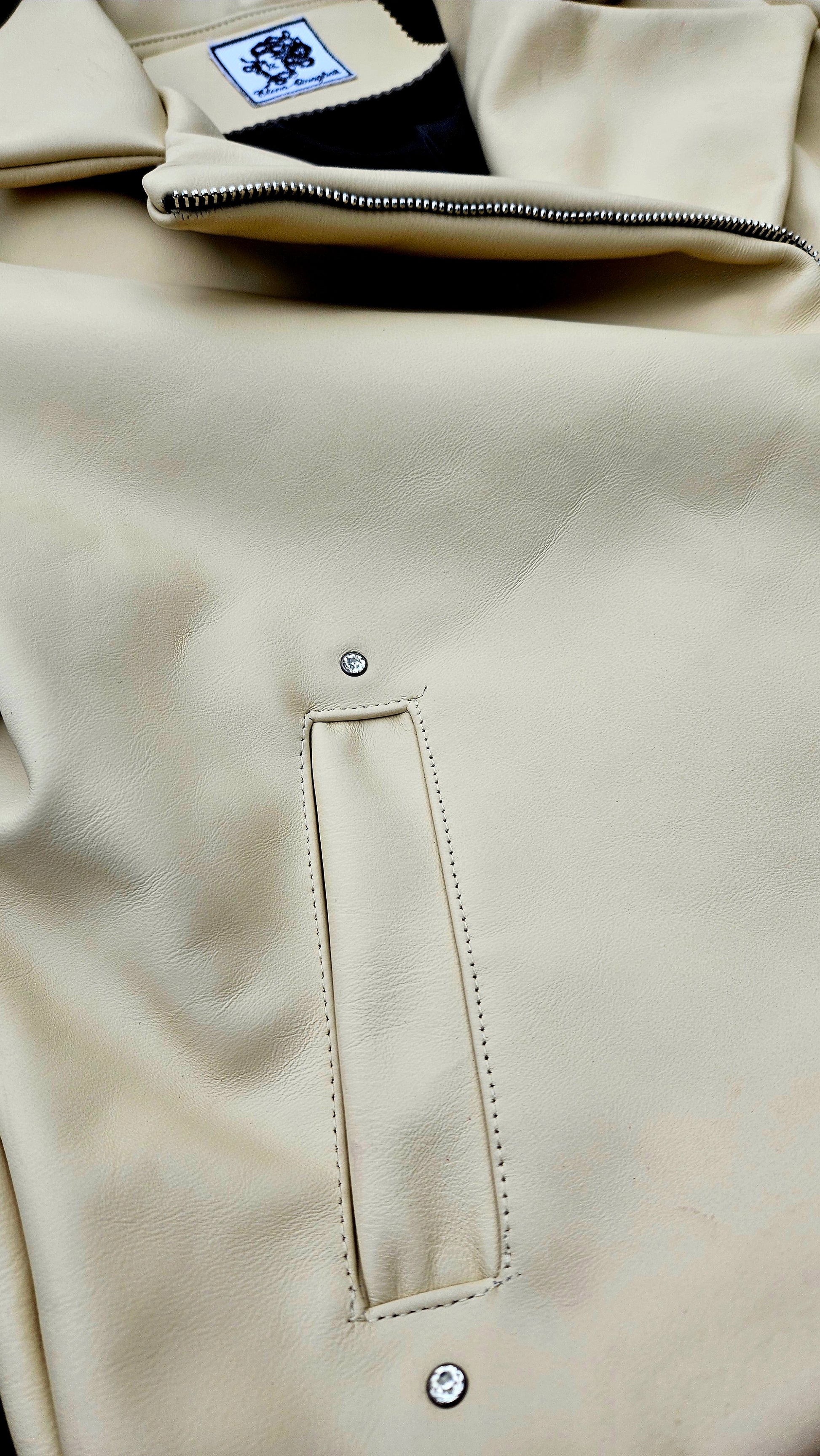 Crafted from genuine ivory-colored leather, it is entirely handmade by an Italian tailor and enhanced with an original hand-painted artwork on the back.