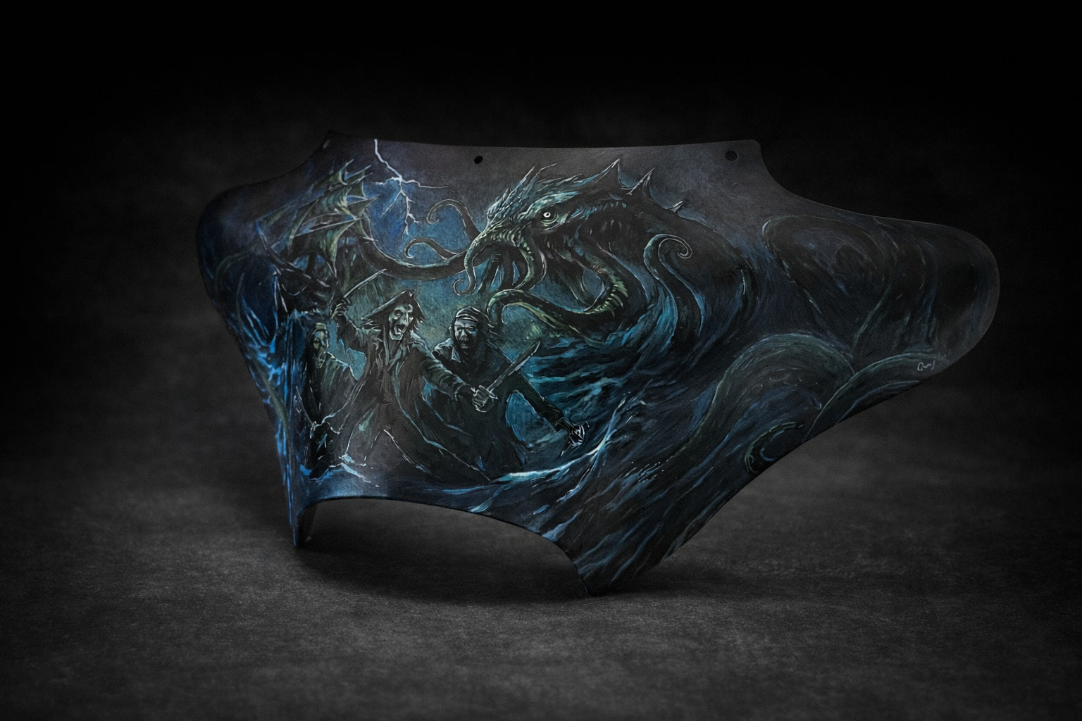 È un pezzo unico dipinto a mano, ispirato al mondo oscuro della pirateria, delle tempeste oceaniche e dei mostri degli abissi.
